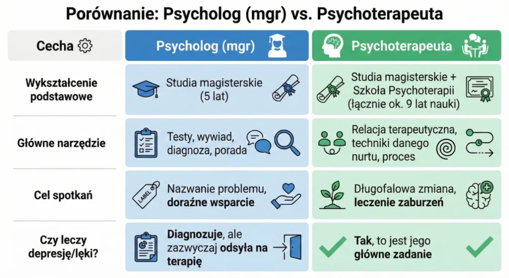 Tymczasem w Polsce (zgodnie ze stanem prawnym na rok 2026) są to dwa różne, choć pokrewne zawody. Zrozumienie tej różnicy jest kluczowe, abyś trafił do specjalisty, który najlepiej odpowie na Twoje aktualne potrzeby.